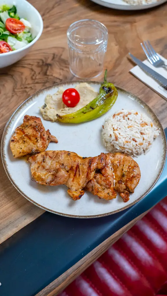 Beğendi, pilav, közlenmiş biber ve domates ile servis edilir.